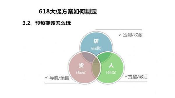 预热期间营销目标: 店铺要常进:持续进行连贯性的主题营销,引导消费者重复访问,增加大促期间的自主访问购买人群;产品要锁定:购物清单制定、人气爆款提前加入购物车、大促专供款预定等等,以产品锁定更多潜在消费者;会员要提醒:店铺长期的新老会员都要在本时期进行再次唤醒,提醒会员特权和优惠,针对不同级别的会员选择到达率不同的用户关怀方式和提醒频率。